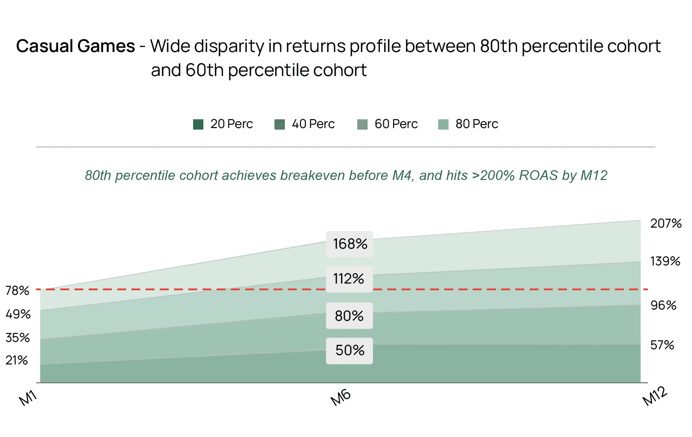 In other words, the majority of gaming companies that were studied invested $1 in marketing and could expect to make less than $2 over the cohort’s lifetime. This effectively means that the most profitable gaming companies are spending in excess of 50% of their net revenues on marketing. Moreover, the vast majority of companies are spending an even higher percentage of their revenues, spending upwards of 75% if they reach a terminal Net ROAS of 130%.