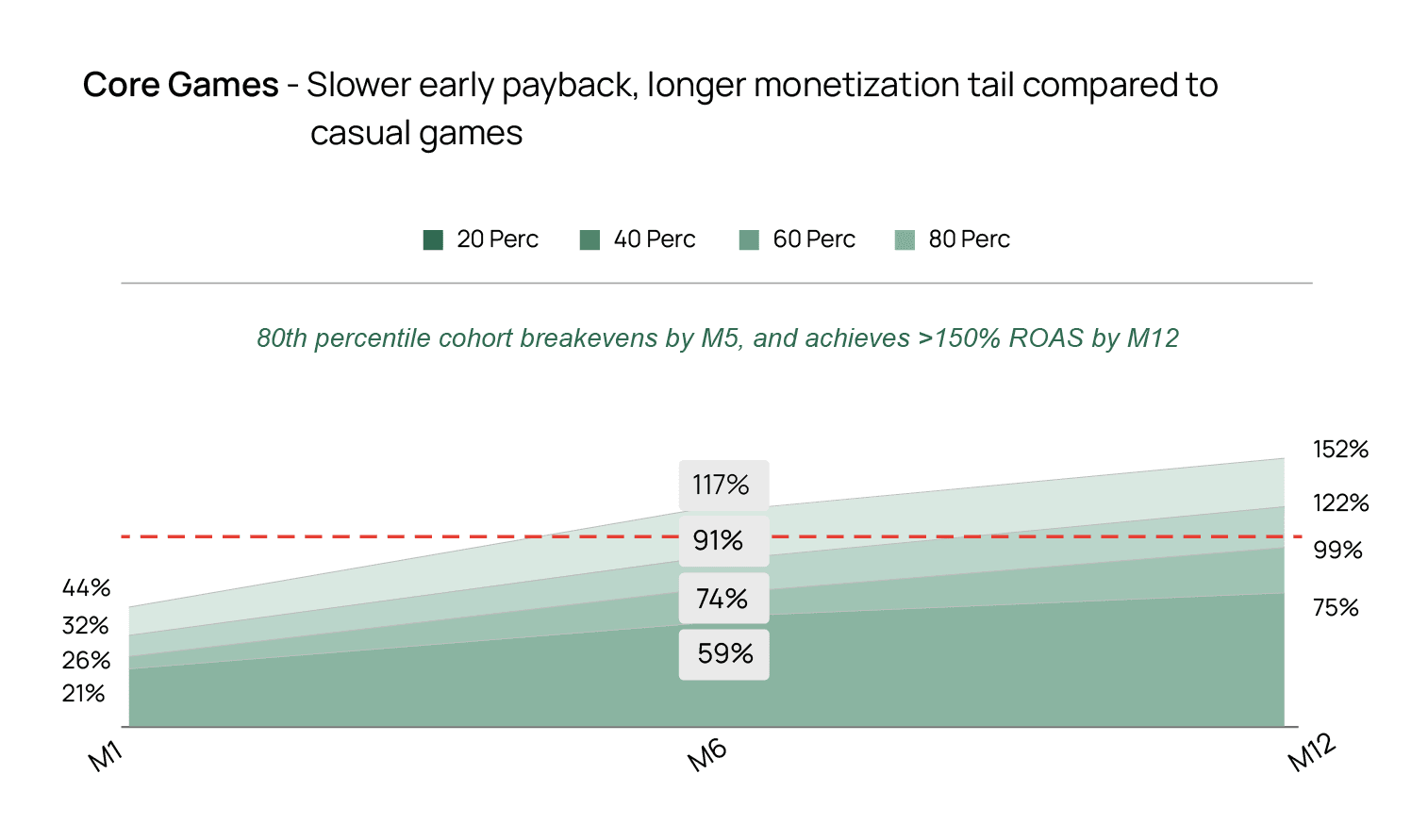 PvX Partners ran an internal study to benchmark Net ROAS performance – defined as return on marketing spends based on net revenues after deducting platform fees – across the Casual and Core gaming categories. Below were the findings: