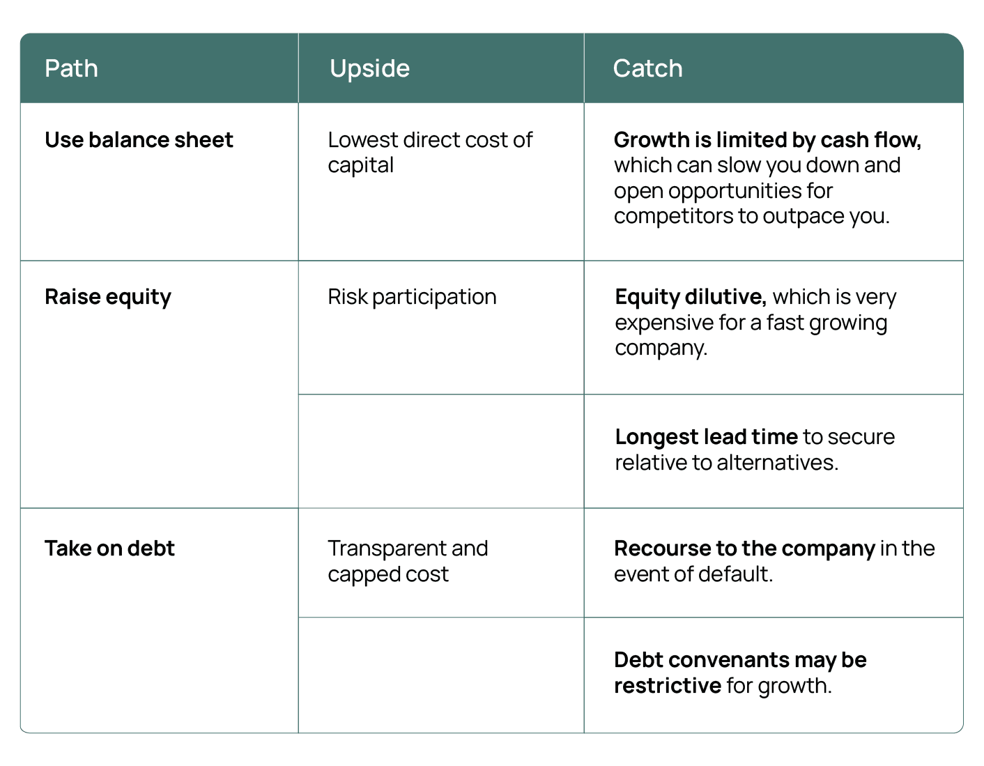 If you have a product that has predictable returns and is growing double digits month-over-month in marketing spend, sourcing capital becomes a pressing and mission critical task. Traditionally, companies have relied on three primary options:
